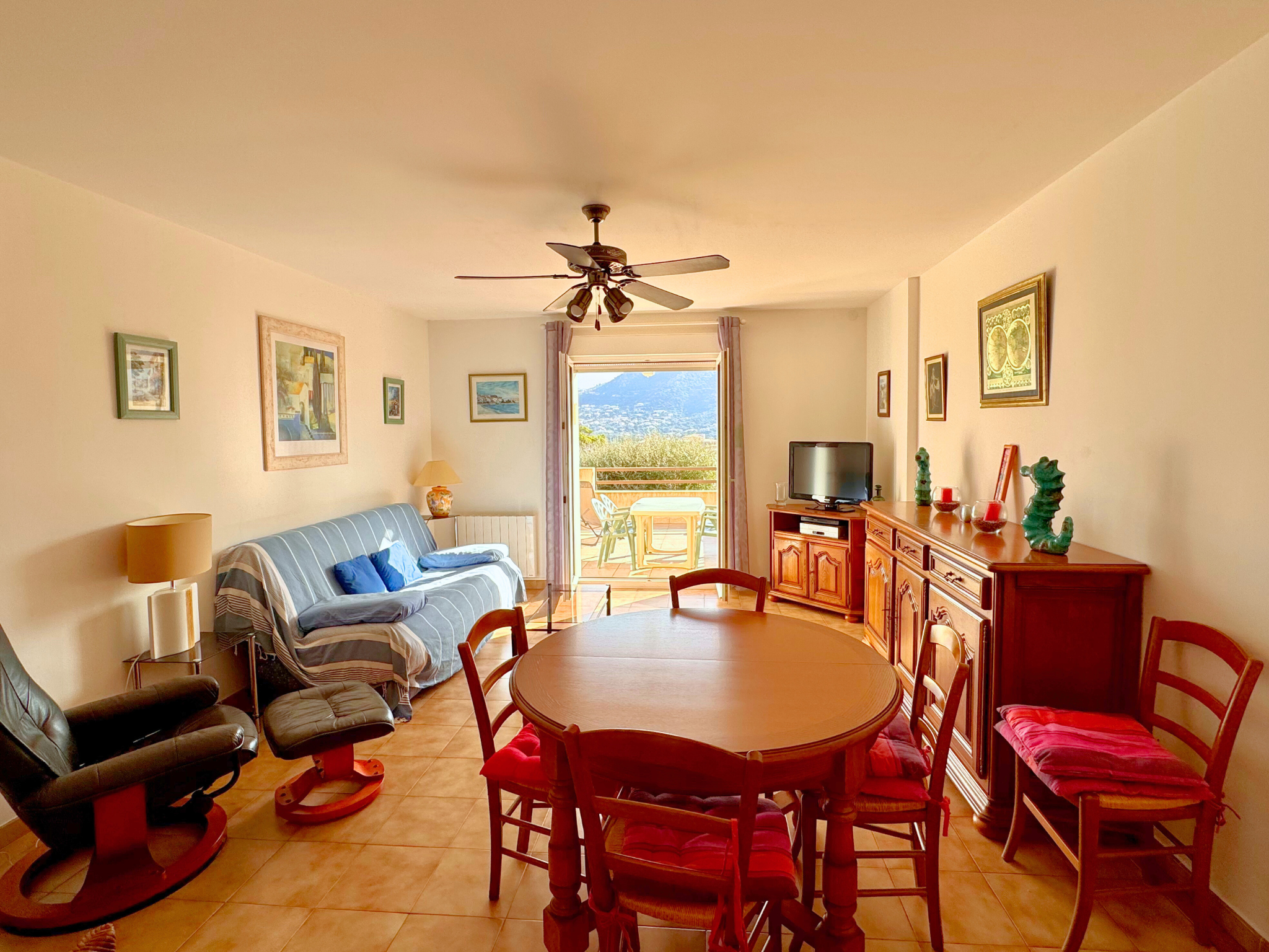 1 salon/salle à manger ouvrant sur une belle terrasse d'environ 22m2 avec vue dégagée sur les montagnes